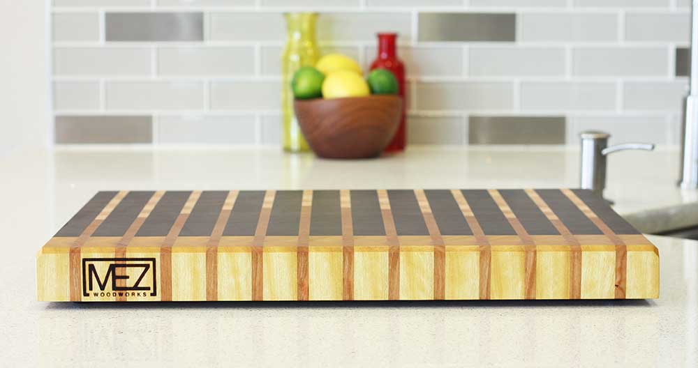 The cherry. It’s there. Maybe not obvious, but that’s the intent. Thick and thin rows of hardwood come together to make this end grain cutting board a piece of art as well as an amazingly durable tool to make any chef proud.